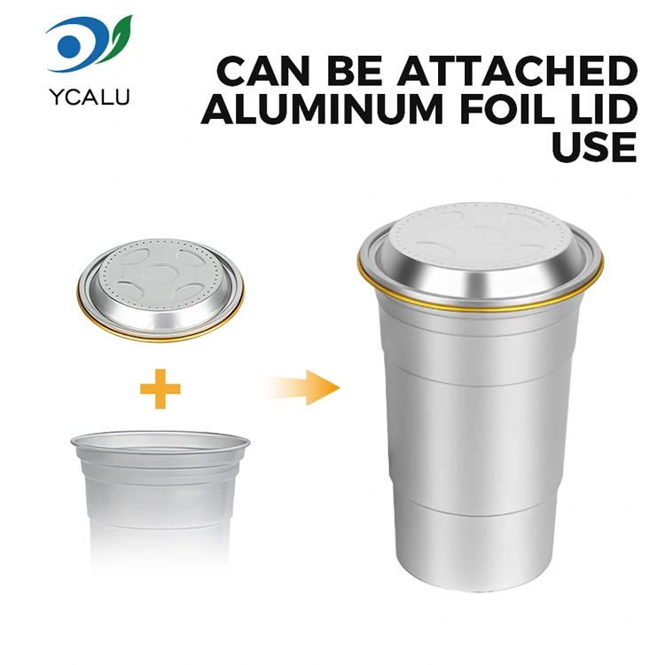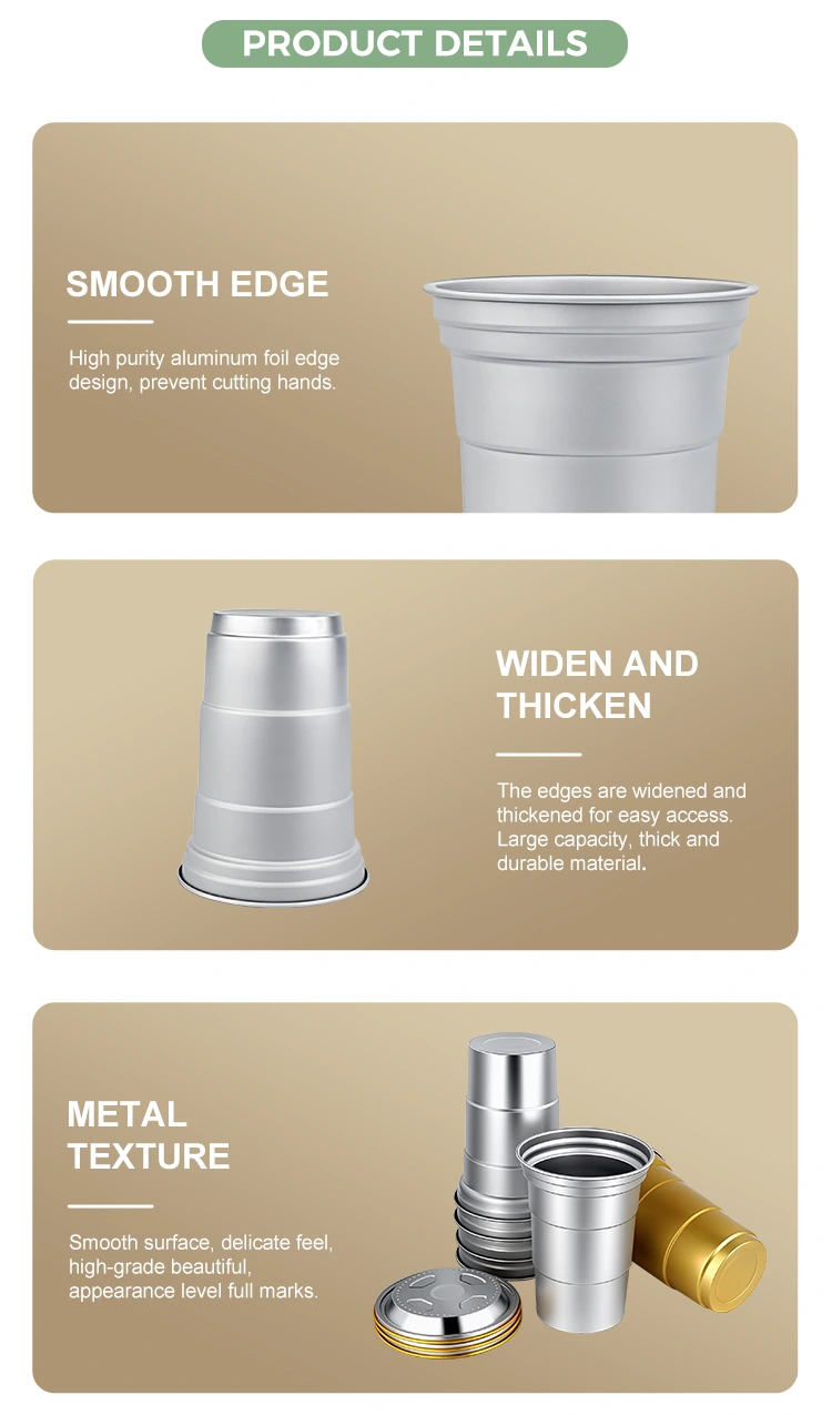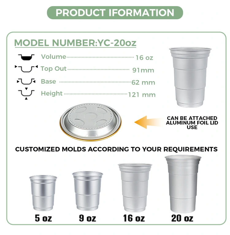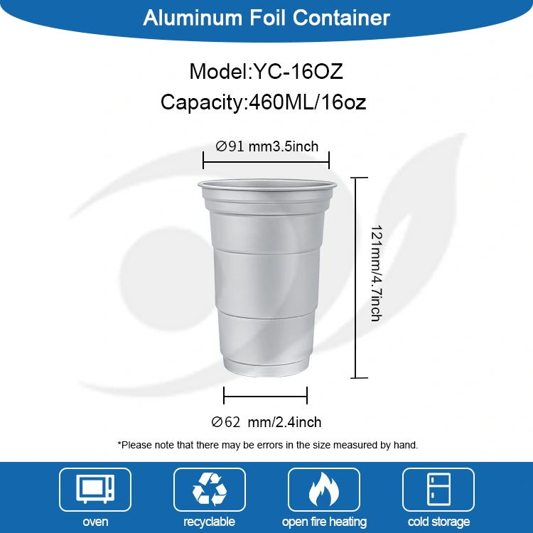 యుంచు ఒక ప్రముఖ చైనా 16oz డిస్పోజబుల్ కస్టమ్ అల్యూమినియం ఫాయిల్ డ్రింక్ కప్ తయారీదారు. ఈ 16oz డిస్పోజబుల్ కస్టమ్ అల్యూమినియం ఫాయిల్ డ్రింకింగ్ కప్ 460-మిల్లీలీటర్ల అల్యూమినియం ఫాయిల్ కప్పు కాఫీ మరియు బీర్ వంటి ప్రామాణిక పానీయాలకు అనువైనది. ఇది ప్రామాణిక డిజైన్‌ను కలిగి ఉంటుంది మరియు తరచుగా అనుకూలీకరణ అవసరాలతో కాఫీ షాపులు మరియు క్రాఫ్ట్ బార్‌లు వంటి వాణిజ్య వినియోగదారులను ప్రధానంగా లక్ష్యంగా చేసుకుంది. సమర్థవంతమైన ఉష్ణ వాహకత మరియు ప్రాథమిక సీలింగ్ పనితీరును అందించేటప్పుడు, ఈ 16oz డిస్పోజబుల్ కస్టమ్ రీసైకిల్ అల్యూమినియం ఫాయిల్ డ్రింక్ కప్ శీఘ్ర మరియు సౌకర్యవంతమైన బ్రాండ్ విజువల్ అనుకూలీకరణ సేవలకు కూడా ఎక్కువ ప్రాధాన్యతనిస్తుంది.