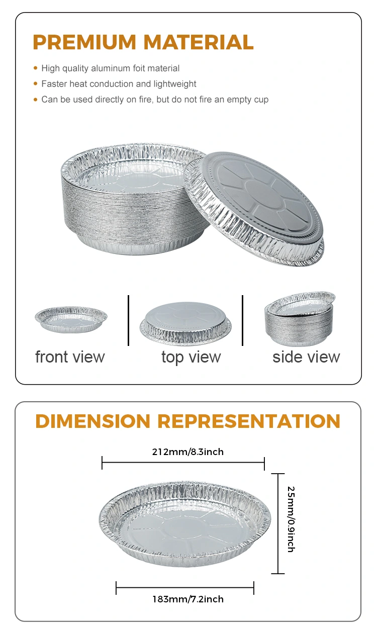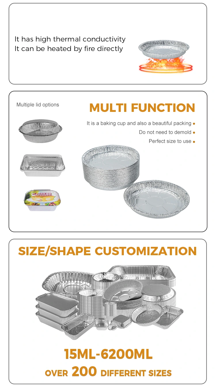 ఈ ఉత్పత్తి యొక్క ట్రాపెజోయిడల్ ఆకారం దృశ్య అందాన్ని జోడించడమే కాక, నిల్వ చేయడం మరియు నిల్వ చేయడం చాలా సులభం, నిల్వ స్థలాన్ని ఆదా చేస్తుంది. అదే సమయంలో, ఈ డిజైన్ వస్తువులను యాక్సెస్ చేయడం సులభం చేస్తుంది మరియు క్షేత్ర కార్యకలాపాల సమయంలో కూడా జారడం అంత సులభం కాదు, ఇది ఉపయోగం యొక్క భద్రతను బాగా మెరుగుపరుస్తుంది. అదనంగా, 7-9 అంగుళాల పిజ్జా పాన్ సిల్వర్ అల్యూమినియం రేకు కంటైనర్లు తేలికపాటి డిజైన్‌ను కలిగి ఉంటాయి, ఇది బహిరంగ పిక్నిక్‌లకు సరైనది. ఇంట్లో లేదా ఆరుబయట అయినా మీరు ఎప్పుడైనా, ఎక్కడైనా మీతో తీసుకెళ్లవచ్చు, ఏ సందర్భంలోనైనా సులభతరం చేస్తుంది.