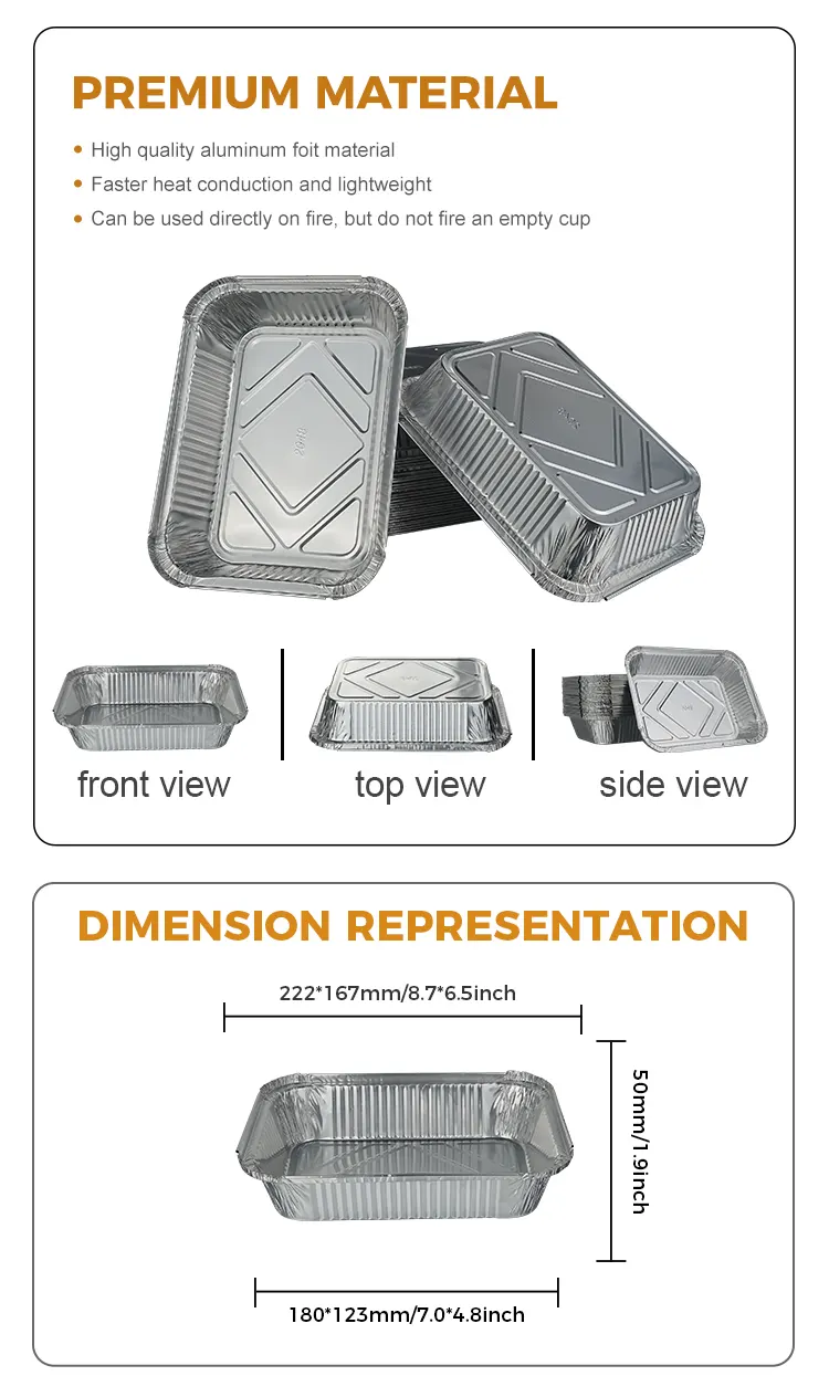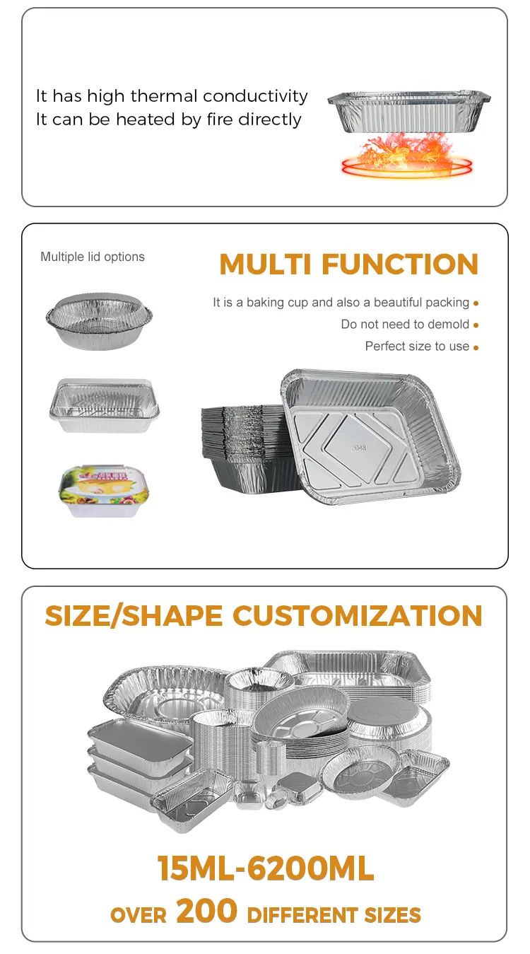 యుంచు అల్యూమినియం ఫాయిల్ ఫ్యాక్టరీ యొక్క డిస్పోజబుల్ బార్బెక్యూ బేకింగ్ లంచ్ బాక్స్ సిల్వర్ అల్యూమినియం ఫాయిల్ కంటైనర్ హై-ప్యూరిటీ ఫుడ్-గ్రేడ్ అల్యూమినియం ఫాయిల్‌తో తయారు చేయబడింది. ఇది విషపూరితం మరియు రుచిలేనిది, అధిక ఉష్ణోగ్రత మరియు తక్కువ ఉష్ణోగ్రతలకు నిరోధకతను కలిగి ఉంటుంది. ద్రవీభవన స్థానం 250 ° C వరకు ఉంటుంది. ఇది ఆహారంతో ప్రత్యక్ష సంబంధంలో ఉంటుంది. అధిక ఉష్ణోగ్రతల వద్ద వేడిచేసినప్పుడు ఇది హానికరమైన పదార్ధాలను విడుదల చేయదు. రిఫ్రిజిరేటెడ్ మరియు స్తంభింపచేసినప్పుడు ఇది స్థిరమైన ఆకృతిని కూడా నిర్వహించగలదు. ఇది వన్-టైమ్ డిజైన్ మరియు ఉపయోగం తర్వాత విసిరివేయబడుతుంది. ప్లేట్లు మరియు బేకింగ్ పాన్‌లను శుభ్రం చేయడానికి సమయం కేటాయించాల్సిన అవసరం లేదు, పూర్తిగా నిర్విషీకరణను ఇది భోజనం తర్వాత శుభ్రపరచడం యొక్క దుర్భరమైన సమస్యను పరిష్కరిస్తుంది మరియు చాలా మంది వ్యక్తులతో సమావేశాలు మరియు బహిరంగ ప్రయాణం వంటి దృశ్యాలకు ప్రత్యేకంగా సరిపోతుంది. అప్‌గ్రేడ్ చేసిన చిక్కగా ఉన్న అల్యూమినియం ఫాయిల్ మెటీరియల్ ఘన ఆకృతిని మరియు బలమైన సహాయక సామర్థ్యాన్ని కలిగి ఉంటుంది. సూప్‌లు లేదా భారీ బార్బెక్యూ పదార్థాలతో వంటలను పట్టుకున్నప్పుడు లీక్ చేయడం లేదా వైకల్యం చేయడం సులభం కాదు. అంచులు మృదువుగా మరియు బర్ర్-రహితంగా ఉంటాయి, ఇది ఉపయోగించడానికి సురక్షితంగా ఉంటుంది. ఇది ఓవెన్‌లు, ఎయిర్ ఫ్రయ్యర్లు, స్టీమర్‌లు మరియు ఇతర వంటగది పాత్రలకు కూడా అనుకూలంగా ఉంటుంది మరియు వండడం మరియు వడ్డించడం ఒక దశలో చేయవచ్చు.