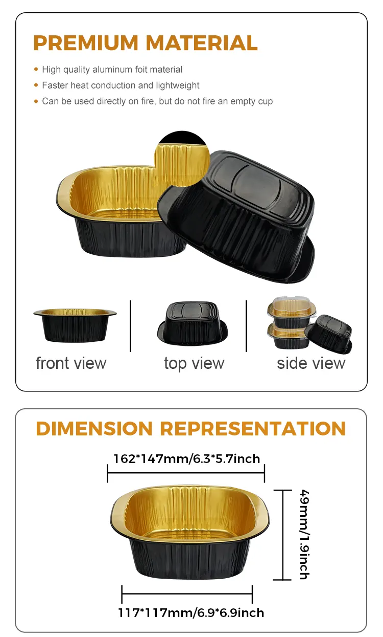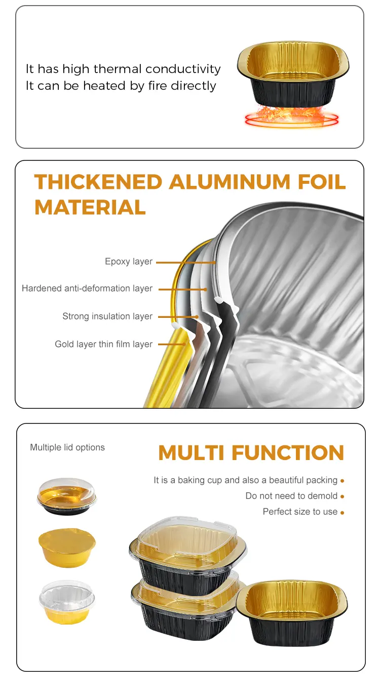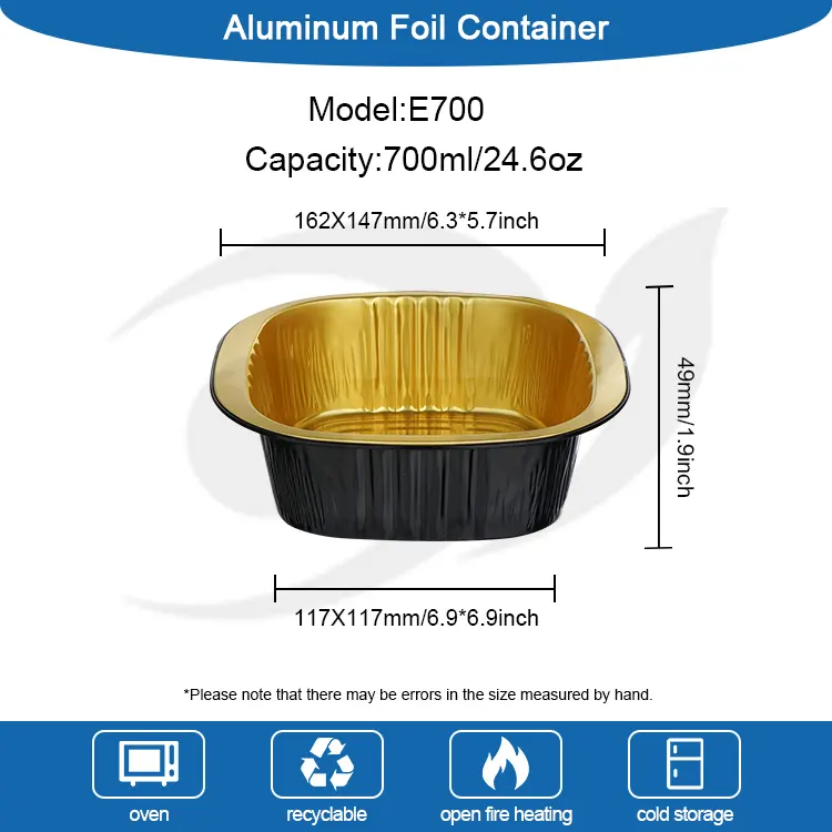 యుంచు అల్యూమినియం ఫాయిల్ సప్లయర్ యొక్క డిస్పోజబుల్ డబుల్-ఇయర్ స్క్వేర్ బాక్స్ బ్లాక్ గోల్డ్ లైట్-వాల్డ్ అల్యూమినియం ఫాయిల్ కంటైనర్‌లో చతురస్రాకార ఆకృతి, పూర్తి స్థల వినియోగం, గుండ్రని మరియు మృదువైన మూలలు, పదునైన బర్ర్స్ లేవు మరియు ఉపయోగించడానికి సురక్షితమైనవి; ఆలోచనాత్మకమైన డబుల్-ఇయర్ డిజైన్, ఎర్గోనామిక్, ఇన్సులేట్ మరియు యాంటీ-స్కాల్డింగ్, తీసుకోవడం సులభం, ఇందులో వేడి భోజనం మరియు సూప్‌లు ఉన్నప్పటికీ, చేతి కాలిన గాయాలను నివారించడానికి మరియు సాంప్రదాయ అల్యూమినియం ఫాయిల్ బాక్సుల యొక్క అసౌకర్య నొప్పిని పరిష్కరించడానికి దీన్ని సులభంగా పట్టుకోవచ్చు. మందమైన అల్యూమినియం ఫాయిల్‌తో తయారు చేయబడింది, ఇది ఘనమైన మరియు కఠినమైన ఆకృతిని కలిగి ఉంటుంది, బలమైన సహాయక సామర్థ్యాన్ని కలిగి ఉంటుంది మరియు సులభంగా వైకల్యం చెందదు లేదా దెబ్బతినదు. ఇది లీకేజీ లేదా సైడ్ లీకేజ్ సమస్యలు లేకుండా సూప్‌లు మరియు కొవ్వులతో కూడిన ఆహారాన్ని కలిగి ఉంటుంది మరియు దాని మన్నిక సాధారణ పునర్వినియోగపరచలేని లంచ్ బాక్స్‌ల కంటే చాలా ఎక్కువ.