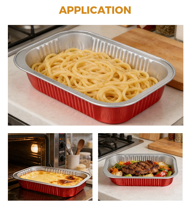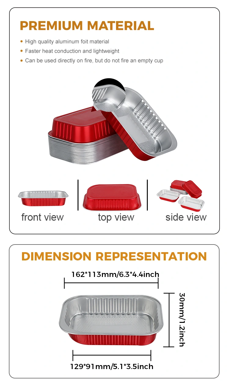 -రెక్టాంగిల్ రెడ్ అల్యూమినియం టేక్ అవుట్ కంటైనర్ యొక్క పదార్థం ఆహారం యొక్క తాజాదనాన్ని మరియు తాజాదనాన్ని లాక్ చేస్తుంది. దాని అద్భుతమైన ఉష్ణ వాహకత మరియు ఇన్సులేషన్ లక్షణాలు దీన్ని నేరుగా ఓవెన్, మైక్రోవేవ్‌లో వేడి చేయడానికి మరియు రిఫ్రిజిరేటర్‌లో శీతలీకరించడానికి అనుమతిస్తాయి, ఇది భోజనం యొక్క అసలు రుచిని సమర్థవంతంగా లాక్ చేస్తుంది మరియు చాలా కాలం పాటు ఆదర్శవంతమైన రుచిని కలిగి ఉంటుంది.