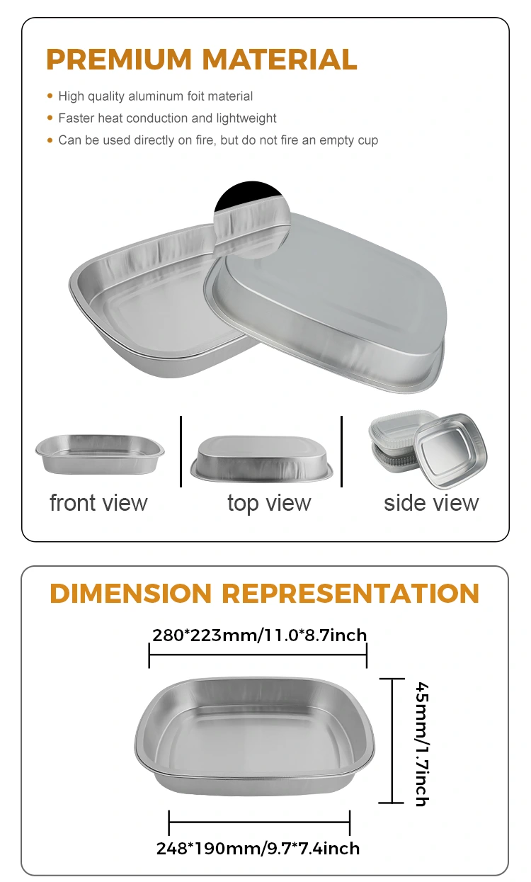 4. టేక్‌అవే స్క్వేర్ స్లివర్ అల్యూమినియం ఫాయిల్ ఫుడ్ ప్యాన్‌లు ఆధునిక వెండి మెరుపుతో అనుబంధించబడిన సరళమైన మరియు చక్కని పంక్తులను అవలంబిస్తాయి. ఇది ఆహారం యొక్క విజువల్ అప్పీల్‌ను మరియు మొత్తం నాణ్యతను మెరుగుపరుస్తుంది, బ్రాండ్ యొక్క వృత్తిపరమైన మరియు ఉన్నత స్థాయి ఇమేజ్‌ను బలోపేతం చేయడంలో సహాయపడుతుంది.