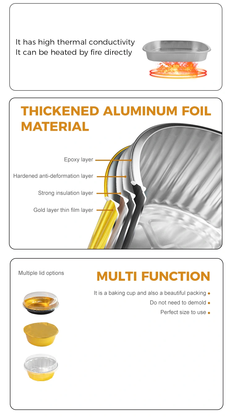 ఇది గుడ్డు టార్ట్‌లు, లడ్డూలు, బుట్టకేక్‌లు, పిజ్జా యొక్క సింగిల్ స్లైస్‌లు లేదా ఫ్లాకీ పేస్ట్రీలకు సరైన ప్యాకేజింగ్. అల్యూమినియం ఫాయిల్ యొక్క ఇన్సులేషన్ లక్షణం పేస్ట్రీలను కాల్చిన వెంటనే వాటి యొక్క వెచ్చదనం మరియు మృదువైన ఆకృతిని నిర్వహించడానికి సహాయపడుతుంది; ఇది ఖచ్చితంగా రుచిని నిలుపుకుంటుంది మరియు బేకరీలు మరియు కేఫ్‌ల నుండి టేకావుట్ చేయడానికి అనుకూలంగా ఉంటుంది.