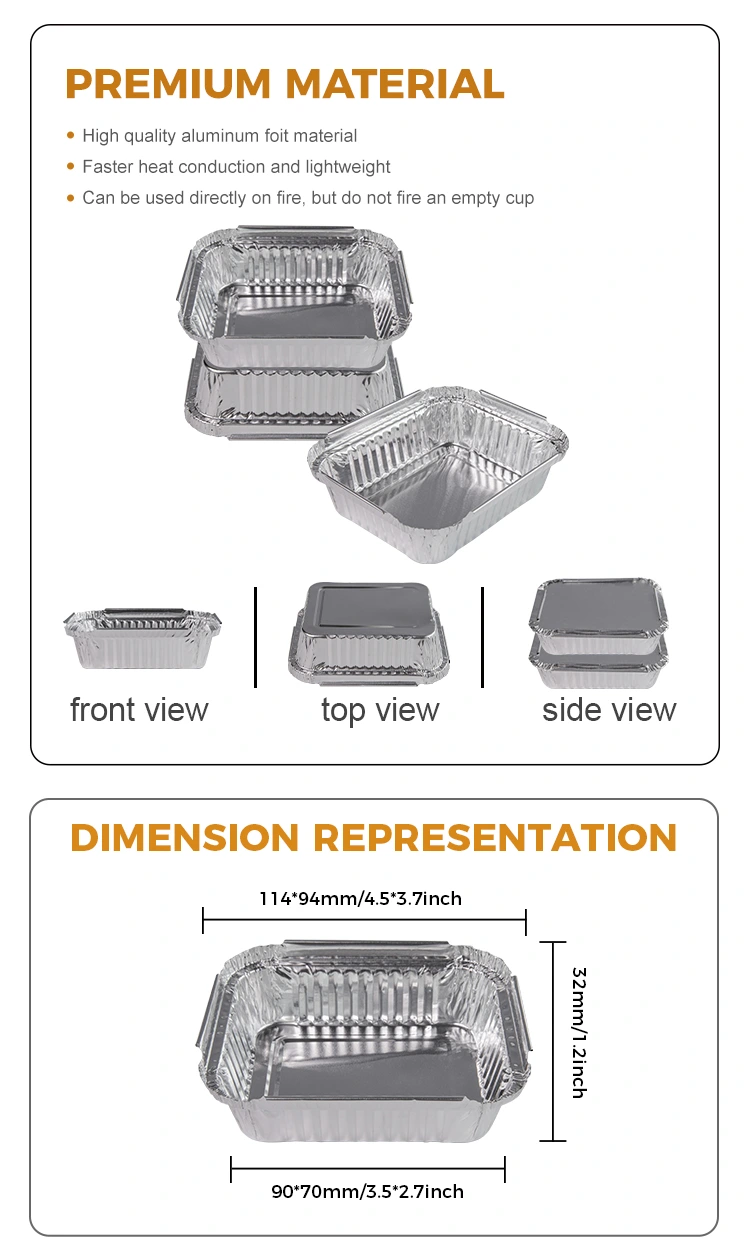 అదనంగా, ఈ పునర్వినియోగపరచలేని బార్బెక్యూ లంచ్ బాక్స్ సిల్వర్ అల్యూమినియం రేకు కంటైనర్ కూడా చాలా సురక్షితం, ఎందుకంటే ఇది అగ్ని ప్రమాదాల గురించి చింతించకుండా సాధారణంగా బహిరంగ మంట కింద ఉపయోగించవచ్చు. అదే సమయంలో, దాని అద్భుతమైన ఉష్ణోగ్రత నిరోధకత మరియు సీలింగ్ కూడా ఆహారాన్ని సురక్షితంగా రవాణా చేయడానికి హామీని ఇస్తాయి, వినియోగదారులు మరియు కస్టమర్లు మరింత విశ్వాసంతో ఉపయోగించుకునేలా చేస్తుంది.