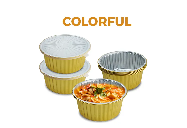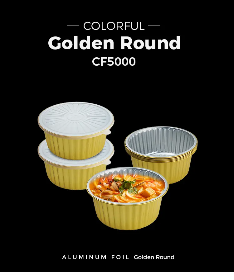 • పునర్వినియోగపరచలేని సీలు చేయదగిన గోల్డెన్ రౌండ్ అల్యూమినియం రేకు కంటైనర్లుపునర్వినియోగపరచలేని సీలు చేయదగిన గోల్డెన్ రౌండ్ అల్యూమినియం రేకు కంటైనర్లు
