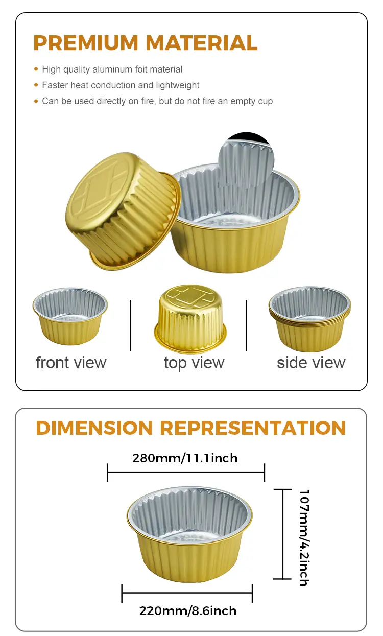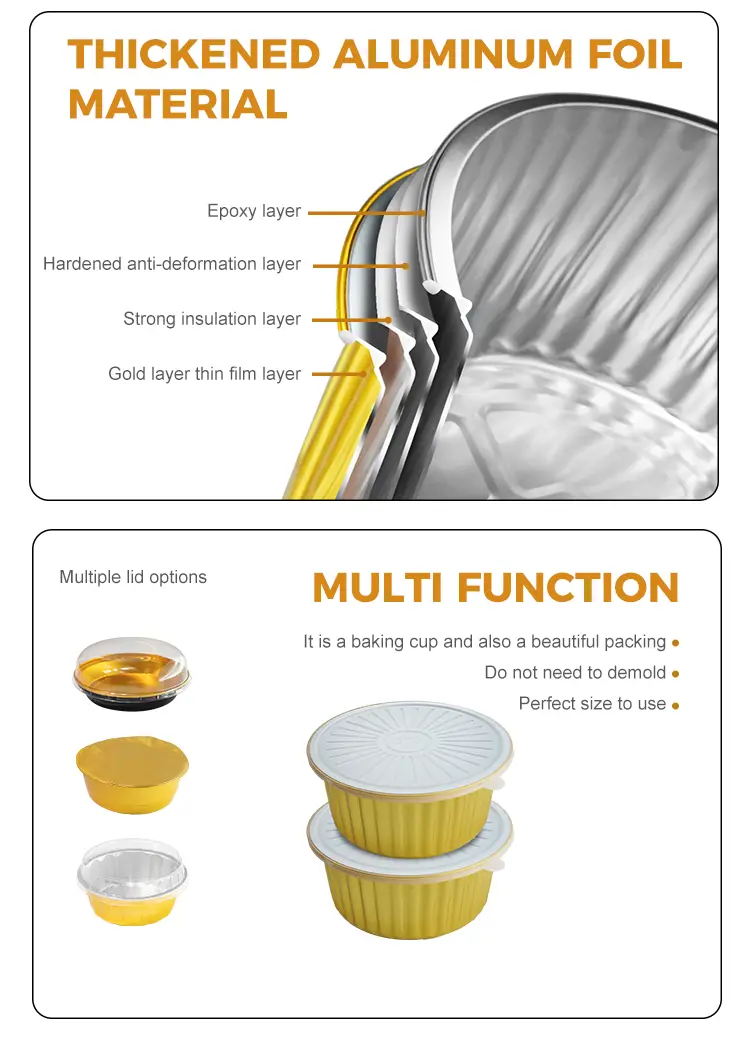 పునర్వినియోగపరచలేని సీలు చేయదగిన గోల్డెన్ రౌండ్ అల్యూమినియం రేకు కంటైనర్లు
