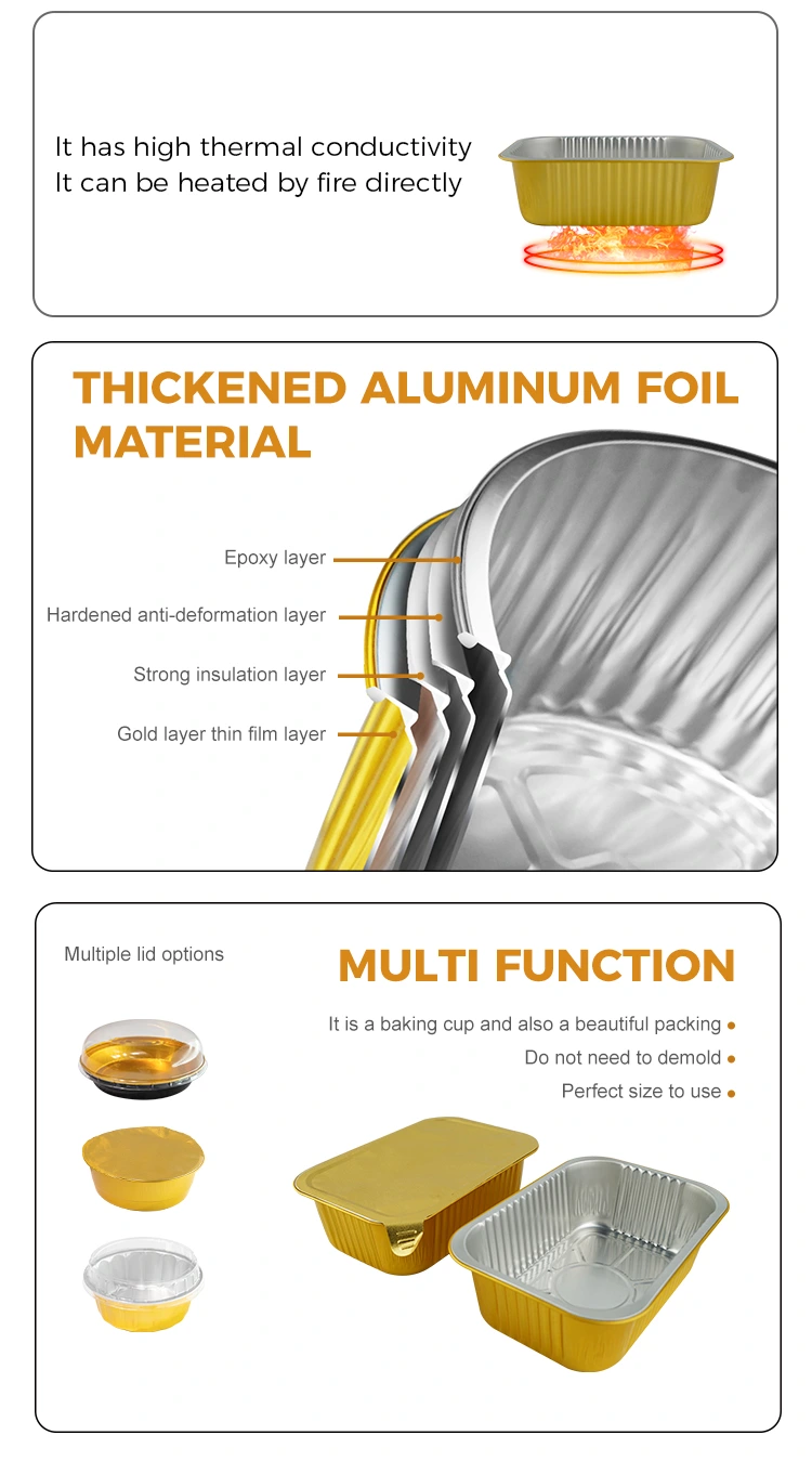 యుంచు అల్యూమినియం రేకు పునర్వినియోగపరచలేని చదరపు సీల్ గ్రాటిన్ అల్యూమినియం ఫాయిల్ కంటైనర్లు, కాల్చిన బియ్యం లేదా కాల్చిన పాస్తా మరియు ఇతర వంటకాల ప్యాకేజింగ్, ప్యాకేజింగ్ లంచ్ బాక్స్ క్యాటరింగ్ మరియు టేక్-అవుట్ యొక్క ఒకే సేవకు అనువైనది, ముందే తయారుచేసిన వంటకాలు ప్యాకేజింగ్ ఉత్పత్తులను ఎంచుకోగలవు, ఈ పునర్వినియోగపరచలేని స్క్వేర్ సీల్ గ్రాట్ గ్రాట్ గ్రాటిన్ ఫాయిల్ కంటైనర్స్ హై-క్వాలిటీ ఫుడ్-గ్రేడ్ అల్యూమినియమ్ ఫాయిల్ కంటైనర్స్. హీట్ సీలింగ్ చిత్రంతో, ఇది సమర్థవంతమైన సీలింగ్ సాధించగలదు మరియు సూప్ యొక్క లీకేజీని సమర్థవంతంగా నిరోధించగలదు, ఇది ఆటోమేటిక్ సీలింగ్ పరికరాలకు అనుకూలంగా ఉంటుంది. కంటైనర్ యొక్క ఉపరితలం మృదువైనది మరియు చదునుగా ఉంటుంది, ఇది లేబుల్ చేయడం సులభం, మరియు ఇది అందంగా మరియు ఉదారంగా ఉంటుంది, ఇది బ్రాండ్ ఇమేజ్‌ను మెరుగుపరచడానికి సహాయపడుతుంది. ఇది అధిక మరియు తక్కువ ఉష్ణోగ్రతలకు నిరోధకతను కలిగి ఉంటుంది, ఇది -20 ° C నుండి 250 ° C ఉష్ణోగ్రత పరిధిలో ఉపయోగించవచ్చు మరియు శీతలీకరణ, బేకింగ్ మరియు ఆవిరి వంటి వివిధ రకాల తాపన పద్ధతులకు మద్దతు ఇస్తుంది. అల్యూమినియం రేకు పదార్థం 100% పునర్వినియోగపరచదగినది మరియు స్థిరమైనది.