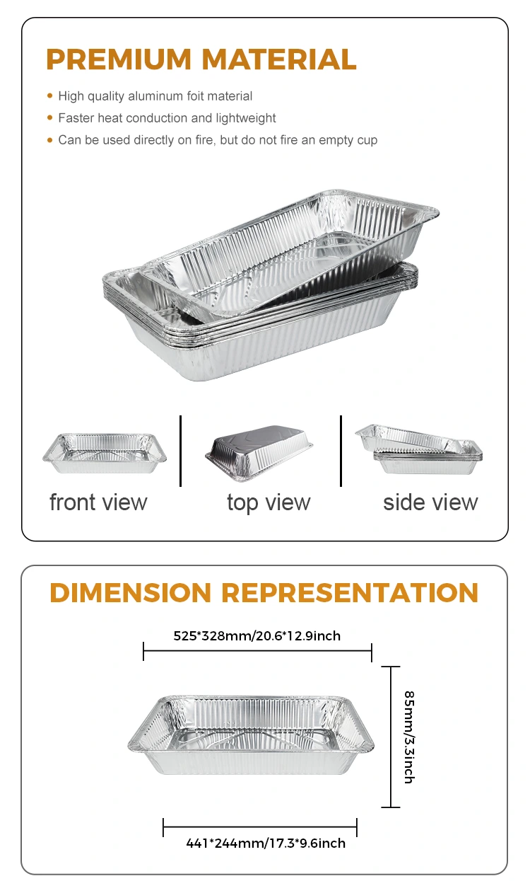 ఫీచర్స్: ఈ పెద్ద సామర్థ్యం గల బహిరంగ బేకింగ్ పాన్ సిల్వర్ రేకు కంటైనర్ ఫుడ్-గ్రేడ్ 8011-0 అల్యూమినియం రేకు పదార్థంతో తయారు చేయబడింది, ఇది ఫుడ్-గ్రేడ్ కాంటాక్ట్ ప్రమాణాన్ని పూర్తిగా కలుస్తుంది, విచిత్రమైన వాసన లేకుండా ఆహార భద్రతను నిర్ధారిస్తుంది మరియు ఉపయోగించడానికి మరింత హామీ ఇస్తుంది. ఇది పుటాకార మరియు కుంభాకార లోపలి రూపకల్పనను కలిగి ఉంది, ఇది ఉపయోగించడానికి మరింత సురక్షితం. పరికరాలు శుభ్రపరచకుండా ఉంటాయి మరియు పరికరాల లైనర్‌ను బాగా రక్షిస్తాయి. బహిరంగ మంట మీద బేకింగ్ లేదా వేడి చేసినా, కంటైనర్ వైకల్యం లేదా ఆహార భద్రతను ప్రభావితం చేయడం గురించి ఆందోళన చెందాల్సిన అవసరం లేదు.