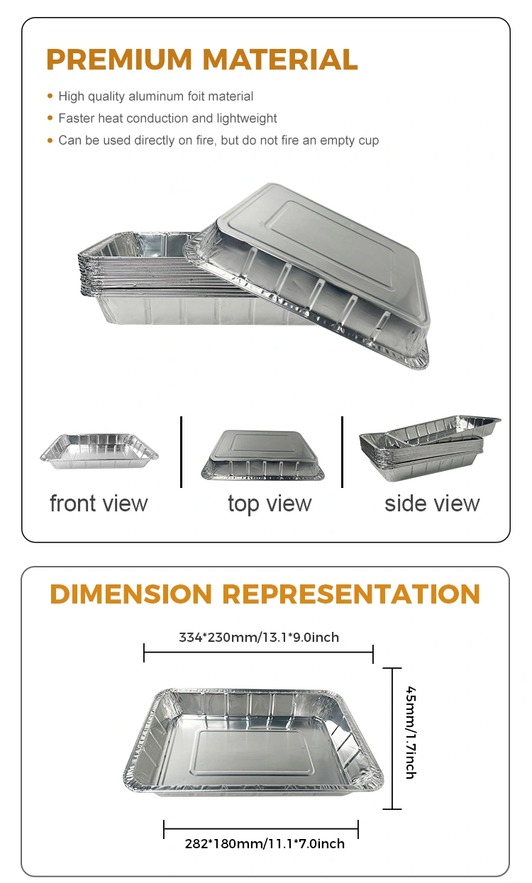 యుంచు అల్యూమినియం రేకు సరఫరాదారు పెద్ద గ్రిల్డ్ ఫిష్ టేక్అవే సిల్వర్ అల్యూమినియం రేకు కంటైనర్లను, వివిధ రకాల వంట అవసరాలను తీరుస్తుంది, ఎయిర్ ఫ్రైయర్స్, బార్బెక్యూ గ్రిల్స్, రోటిస్సేరీ ఓవెన్లు మరియు సీఫుడ్ మేకింగ్ వంటి వివిధ సందర్భాలకు అనువైనది. ఈ అల్యూమినియం రేకు కంటైనర్ ప్రత్యేకంగా పెరిగిన అంచుతో రూపొందించబడింది, ఆహారాన్ని కుండ గోడకు చిందించకుండా మరియు అంటుకోకుండా సమర్థవంతంగా నిరోధించడానికి మరియు పాన్ లైనర్‌ను బహుళ పొరలతో రక్షిస్తుంది, ఇది ఆచరణాత్మక మరియు ఆందోళన లేనిది. ఇది ఫుడ్-గ్రేడ్ 8011-0 పదార్థంతో తయారు చేయబడింది, వేడి-నిరోధక ఉష్ణోగ్రత 520 ° C వరకు, కాలిపోదు లేదా విరిగిపోదు, మరియు మందమైన పదార్థం వైకల్యం చేయడం సులభం కాదు. అల్యూమినియం రేకు పెట్టె మొత్తంగా చిక్కగా ఉంటుంది, కాబట్టి మీరు ఉపయోగం సమయంలో వైకల్యం గురించి చింతించకుండా వంట చేసిన తర్వాత దాన్ని సులభంగా తీయవచ్చు. హేమ్డ్ డిజైన్ పట్టుకోవడం సౌకర్యంగా ఉంటుంది మరియు అంచులు గుండ్రంగా ఉంటాయి, కాబట్టి మీరు మీ వేళ్లను గోకడం గురించి ఆందోళన చెందాల్సిన అవసరం లేదు. మృదువైన అంచులు పెంపుడు జంతువుల పూర్తిగా పారదర్శక మూతలు మరియు అల్యూమినియం రేకు రేకు మూతలతో సంపూర్ణంగా ఉంటాయి, ఇవి వివిధ రకాల వంట పద్ధతులకు మరింత అనుకూలంగా ఉంటాయి.