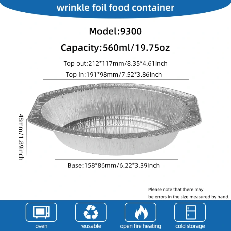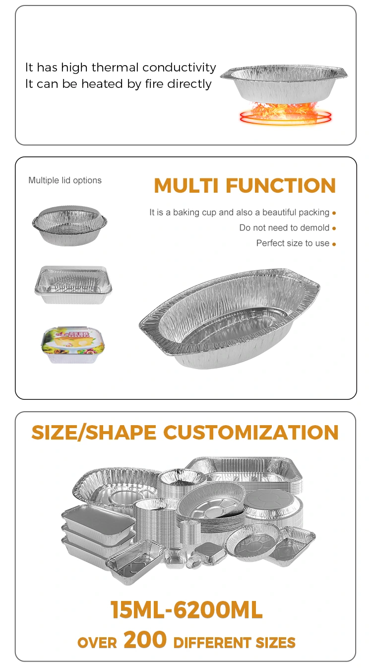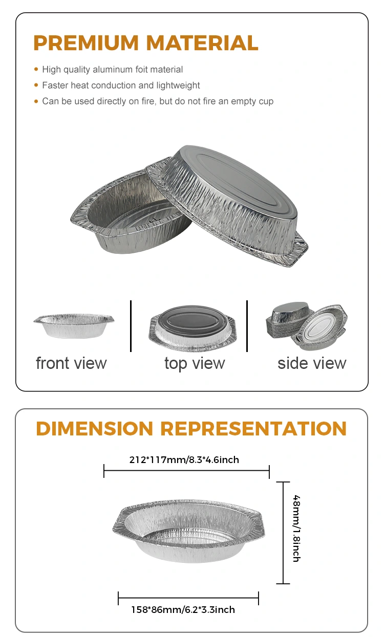 యుంచు అల్యూమినియం రేకు సరఫరాదారు హోమ్ వంట, బేకరీలు, గొలుసు దుకాణాలు మరియు రిఫ్రిజిరేటెడ్ ఫుడ్ డెలివరీ కోసం ఓవల్ కాల్చిన బ్రెడ్ సిల్వర్ అల్యూమినియం రేకు కంటైనర్లను అందిస్తుంది. ఫుడ్-గ్రేడ్ అల్యూమినియం రేకు పదార్థం నుండి రూపొందించిన ఈ కంటైనర్ ఒక ప్రత్యేకమైన ఓవల్ ఆకారాన్ని కలిగి ఉంది, ఇది అనేక సిల్వర్ బేకింగ్ బాక్స్‌లలో నిలుస్తుంది. ఈ కంటైనర్ వేడి రుమాలు, పండ్లు, రొట్టె మరియు అన్ని రకాల రిటార్ట్ ఫుడ్స్ పట్టుకోవటానికి ప్రత్యేకంగా అనుకూలంగా ఉంటుంది మరియు విస్తృత శ్రేణి టేబుల్వేర్ యొక్క అవసరాలను తీర్చగలదు. మంచి ఉష్ణ వాహకత కారణంగా, ఇది అధిక ఉష్ణోగ్రతలను సమానంగా వెదజల్లుతుంది, ఇది ఆహారం సమానంగా వేడి చేయబడిందని నిర్ధారిస్తుంది. అదనంగా, ఇది ఒక నిర్దిష్ట లోడ్-బేరింగ్ సామర్థ్యం మరియు పీడన నిరోధకతను కలిగి ఉంది, బహుళ స్టాక్‌ల విషయంలో కూడా స్థిరత్వాన్ని కొనసాగించడం, వైకల్యాన్ని నివారించడం మరియు రవాణా సమయంలో ఉపయోగం కోసం అనువైనది. విభిన్న దృశ్యాలు మరియు అవసరాలకు బాగా అనుగుణంగా, ఈ కంటైనర్‌ను కస్టమర్ అవసరాలకు అనుగుణంగా అనుకూలీకరించవచ్చు మరియు అదనపు ప్రాక్టికాలిటీ కోసం సరిపోయే మూతలను అందించవచ్చు.
