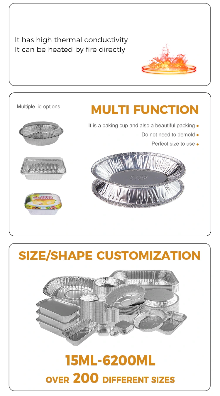 ఫీచర్స్: వన్-పీస్ అచ్చు చిక్కగా మరియు కాల్చిన-నిరోధకతను, ఆహార కాంటాక్ట్ గ్రేడ్ అల్యూమినియం రేకు పదార్థాన్ని అవలంబించడం, మిగిలినవి ఆహారాన్ని సంప్రదించమని హామీ ఇవ్వబడ్డాయి, వైకల్యం చేయడం సులభం కాదు మరియు లీక్ చేయకూడదు, బలమైన మందం, తుప్పు నిరోధకత, అధిక ఉష్ణోగ్రత నిరోధకత.