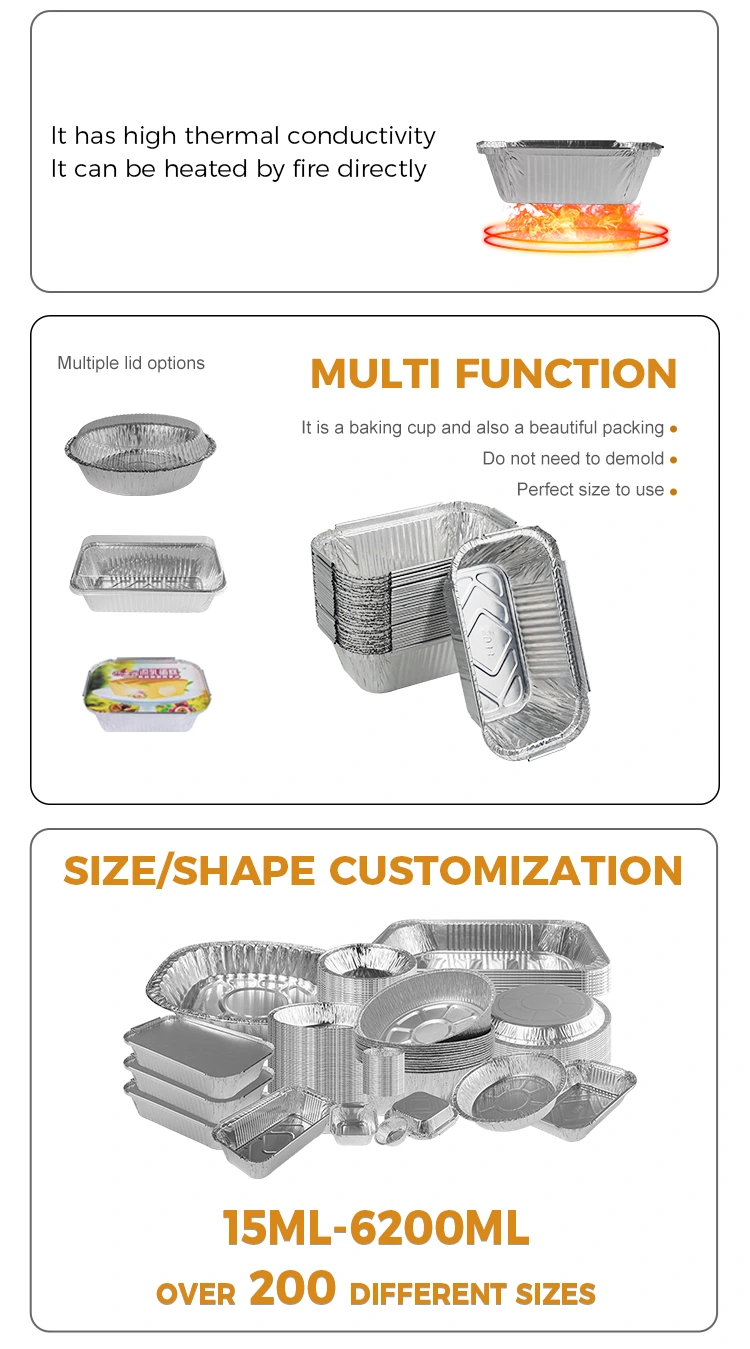 ఫీచర్స్: మేము అందించే అల్యూమినియం రేకు భోజన పెట్టె 8011 అల్యూమినియం రేకు పదార్థంతో తయారు చేయబడింది, ఇది అద్భుతమైన ఉష్ణ సంరక్షణ పనితీరును కలిగి ఉంటుంది మరియు ఆహారం యొక్క ఉష్ణోగ్రతను సమర్థవంతంగా నిర్వహించగలదు, మీ ఆహారాన్ని మరింత ఆకర్షణీయంగా చేస్తుంది. ప్రత్యేకించి, మా దీర్ఘచతురస్రాకార కాల్చిన బియ్యం సిల్వర్ అల్యూమినియం రేకు కంటైనర్లలో థర్మల్ ఇన్సులేషన్ లక్షణాలను కలిగి ఉండటమే కాకుండా, లోగోల యొక్క వ్యక్తిగతీకరించిన అనుకూలీకరణను సులభతరం చేయడానికి అల్యూమినియం రేకు మూతలు లేదా పిఇటి ప్లాస్టిక్ మూతలతో కలపవచ్చు, తద్వారా కస్టమర్ మెమరీ పాయింట్లను పెంచుతుంది మరియు బ్రాండ్ అవగాహనను పెంచుతుంది.
