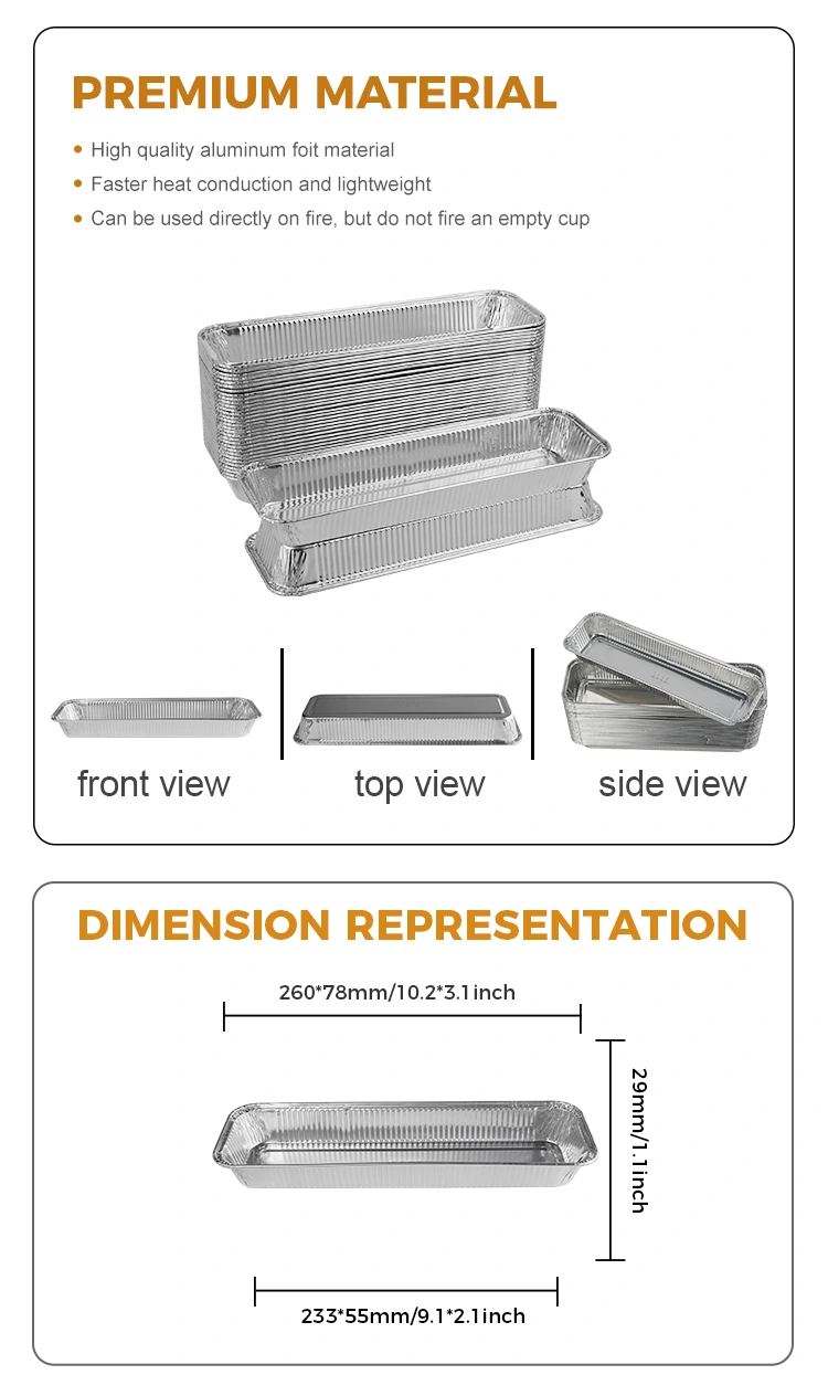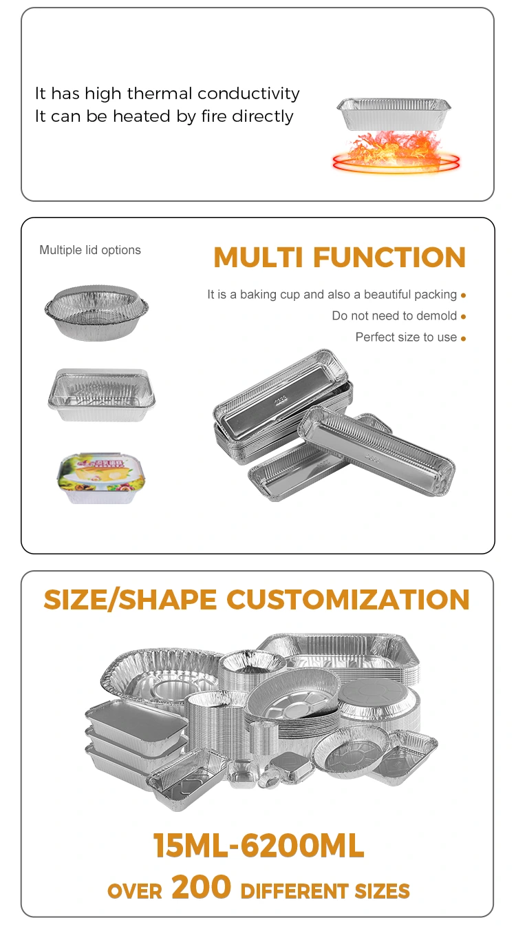 ఫీచర్స్: లంచ్ బాక్స్ టోకు 8011 అల్యూమినియం రేకు పదార్థంతో తయారు చేయబడింది, ఇది మంచి ఉష్ణ సంరక్షణ ప్రభావాన్ని కలిగి ఉంటుంది మరియు ఆహారం యొక్క ఉష్ణోగ్రతను నిర్వహించగలదు, ఆహారాన్ని మరింత రుచికరమైన మరియు రుచికరమైనదిగా చేస్తుంది. అదనంగా, మా దీర్ఘచతురస్రాకార BBQ సిల్వర్ అల్యూమినియం రేకు కంటైనర్ కూడా హీట్ ఇన్సులేషన్ ఫంక్షన్‌ను కలిగి ఉంది మరియు దీనిని అల్యూమినియం రేకు మూత మరియు PET ప్లాస్టిక్ మూతతో సరిపోల్చవచ్చు.