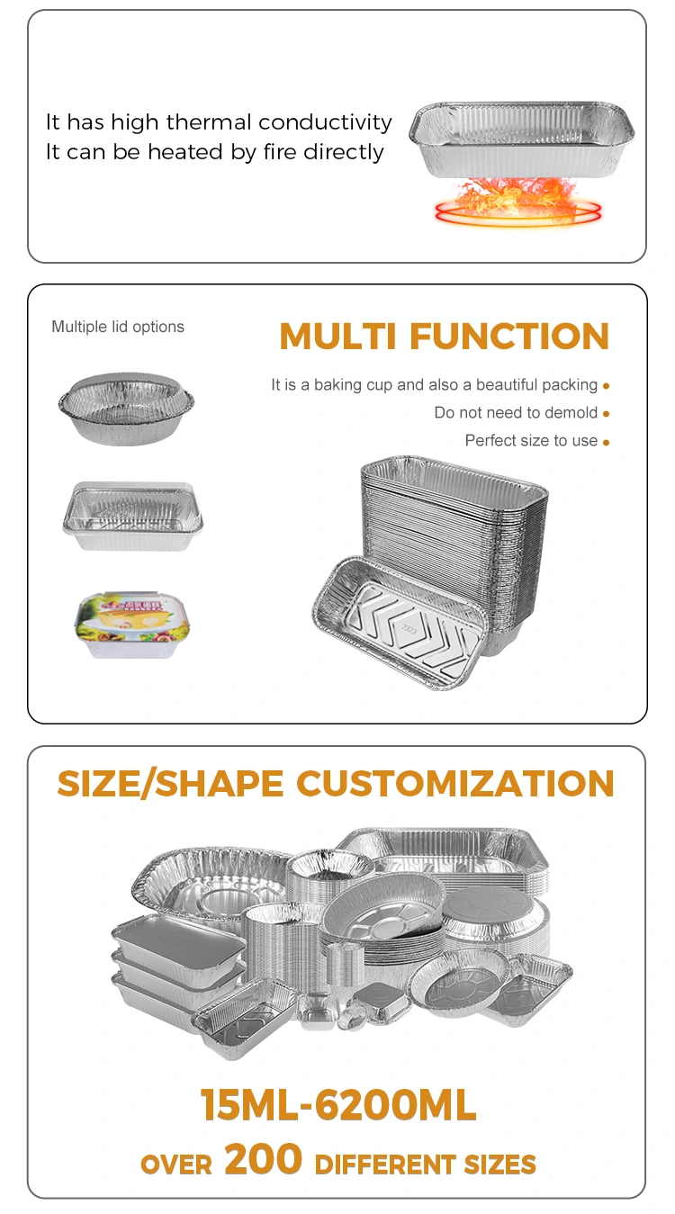 ఫీచర్స్: లంచ్ బాక్స్ టోకు 8011 అల్యూమినియం రేకు పదార్థం మంచి వేడి సంరక్షణతో తయారు చేయబడింది, ఇది ఆహార ఉష్ణోగ్రతను నిర్వహించగలదు మరియు ఆహారాన్ని మరింత రుచికరంగా చేస్తుంది. అదనంగా, మా దీర్ఘచతురస్రాకార బార్బెక్యూ సిల్వర్ అల్యూమినియం రేకు కంటైనర్ కూడా హీట్ ప్రిజర్వేషన్ ఫంక్షన్‌ను కలిగి ఉంది, దీనిని అల్యూమినియం రేకు పేపర్ మూత మరియు పెట్ ప్లాస్టిక్ మూతతో సరిపోల్చవచ్చు, ఇది మీ లోగోను అనుకూలీకరించడానికి, కస్టమర్ ముద్రను మరింత లోతుగా చేయడానికి మరియు మీ బ్రాండ్ ఇమేజ్‌ను మెరుగుపరచడానికి మీకు సౌకర్యంగా ఉంటుంది.