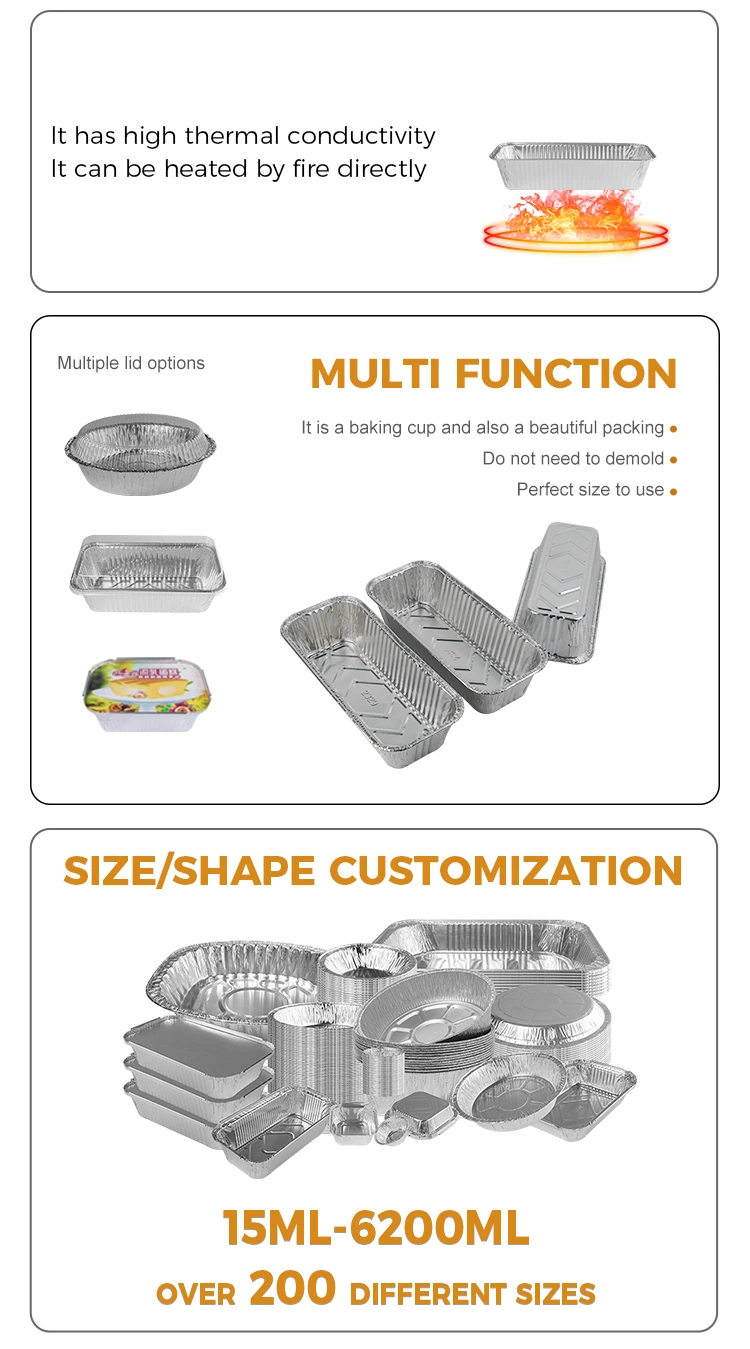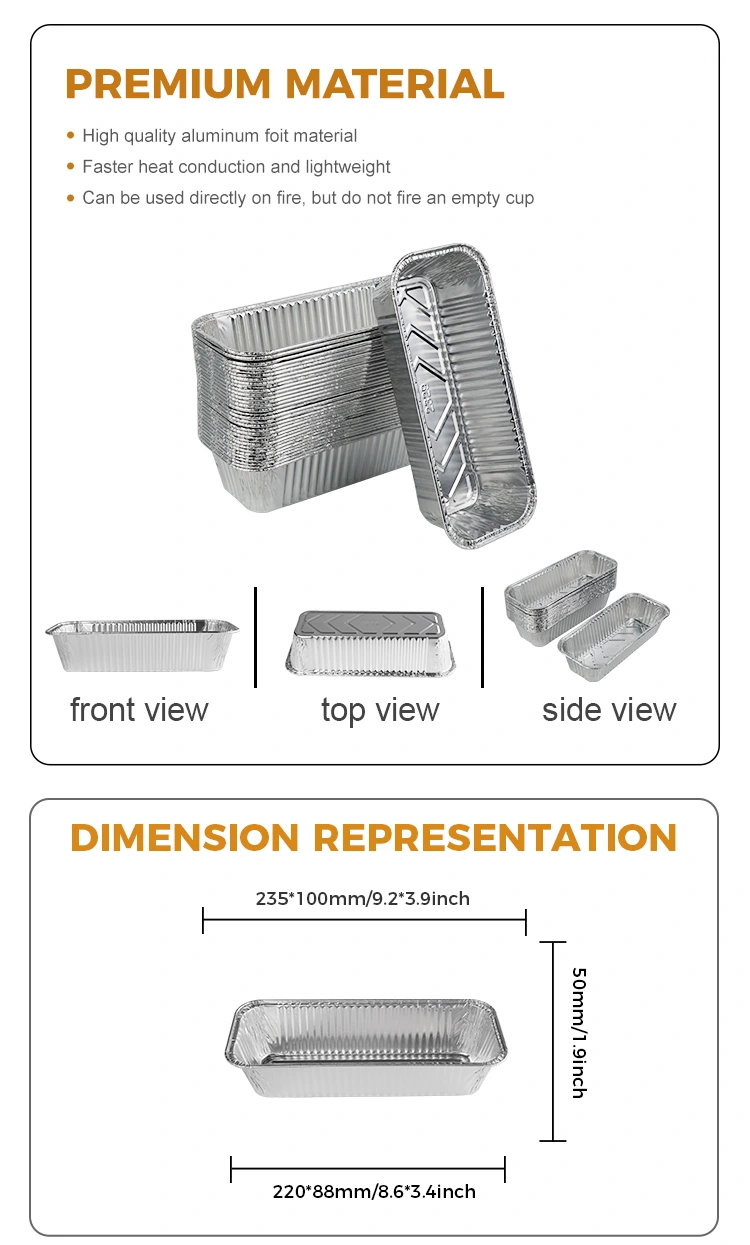 ఈ కంటైనర్ వేడి-నిరోధక మరియు చమురు-నిరోధకతను మాత్రమే కాకుండా, కాల్చడం చాలా సులభం, ఇది ఎయిర్ ఫ్రైయర్స్ మరియు ఇతర పరికరాలలో ఉపయోగం కోసం ప్రత్యేకంగా అనుకూలంగా ఉంటుంది. ఆహారం లేదా సూప్ దానిలో ఎండిపోతున్నట్లు చింతించకుండా ఉపయోగించినప్పుడు దానిలో ఉంచండి. గృహ వినియోగదారుల కోసం, ఇది మరింత శుభ్రంగా మరియు సౌకర్యవంతంగా ఉంటుంది, నో-వాష్ డిజైన్‌తో శుభ్రపరచడం సులభం మరియు వేగంగా చేస్తుంది. దీర్ఘచతురస్రాకార BBQ మందమైన వెండి అల్యూమినియం రేకు కంటైనర్ మీ వంటగదిలో ఒక అనివార్యమైన సహాయకుడు. ఇది రోజువారీ వంట లేదా ప్రత్యేక సందర్భాల కోసం అయినా, ఇది సరైన పరిష్కారాన్ని అందిస్తుంది. మీ వంట జీవితాన్ని మరింత సౌకర్యవంతంగా మరియు రుచికరంగా మార్చడానికి వచ్చి షాపింగ్ చేయండి!