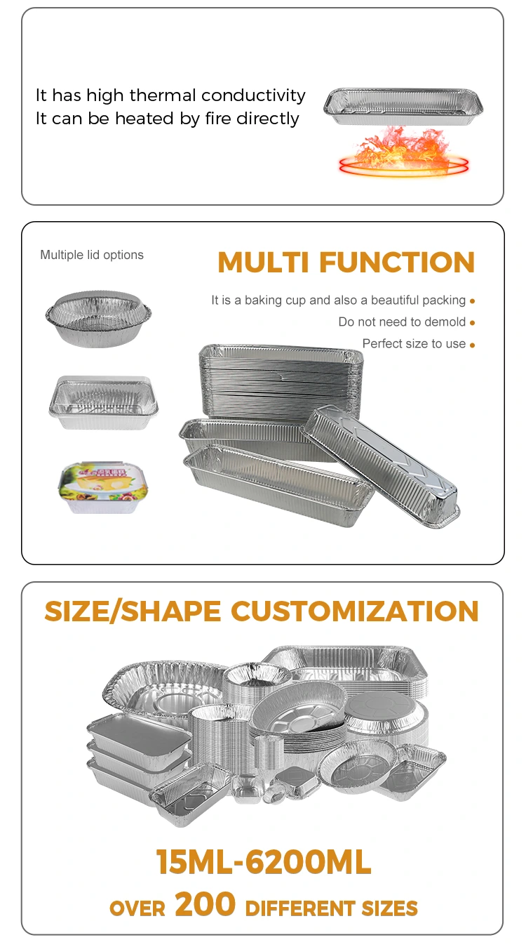 యుంచు అల్యూమినియం ఫాయిల్ సరఫరాదారు దీర్ఘచతురస్రాకార బ్రెడ్ ట్రే బేకింగ్ సిల్వర్ అల్యూమినియం రేకు కంటైనర్లు, వివిధ రకాల తాపన పద్ధతులు, మీరు ఎప్పుడైనా బేకింగ్ యొక్క ఆనందాన్ని ఆస్వాదించవచ్చు, మరింత ప్రభావవంతమైన ఇన్సులేషన్ మరియు తాజాదనం, అప్‌గ్రేడ్ మరియు మందమైన డిజైన్, పర్యావరణ పరిరక్షణ మరియు ఎడ్జ్ అడ్డంకులు దిగువ భాగంలో కాలిపోవడం అంత సులభం కాదు, ఆహారం బాగా తగ్గించబడుతుంది, ఈ ఉత్పత్తి బార్బెక్యూ మరియు బేకింగ్ రంగంలో విస్తృతంగా ఉపయోగించబడుతుంది, ముఖ్యంగా క్యాంపింగ్, బేకరీ, బార్బెక్యూ స్టాల్స్, టేకావే డెలివరీ మరియు సుషీ రెస్టారెంట్లు మరియు ఇతర సందర్భాలకు అనువైనది. ఇది చాలా గృహాలు మరియు దుకాణాల ఆచరణాత్మక అవసరాలను తీర్చడానికి రూపొందించబడింది.