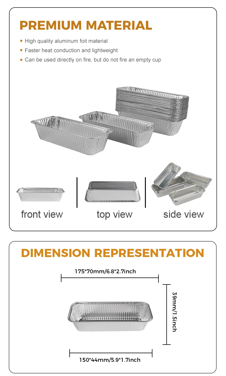 యుంచు అల్యూమినియం రేకు సరఫరాదారు అందించిన దీర్ఘచతురస్రాకార బ్రెడ్ ట్రే సిల్వర్ అల్యూమినియం రేకు కంటైనర్లు ఫుడ్-గ్రేడ్ పదార్థాలతో తయారు చేయబడతాయి మరియు వివిధ రకాల అనువర్తన దృశ్యాలకు అనుకూలంగా ఉంటాయి. ఈ ఉత్పత్తి ముఖ్యంగా గ్రిల్లింగ్ మరియు బేకింగ్ ప్రయోజనాలకు అనుకూలంగా ఉంటుంది, అంటే రొట్టె లేదా బేకింగ్ యొక్క పొడవైన రొట్టెలను తయారు చేయడం. ఇది బొగ్గు గ్రిల్లింగ్ కోసం లేదా టేకావే డెలివరీ బాక్స్‌గా అయినా, ఇది ఉపయోగం కోసం సరైనది.