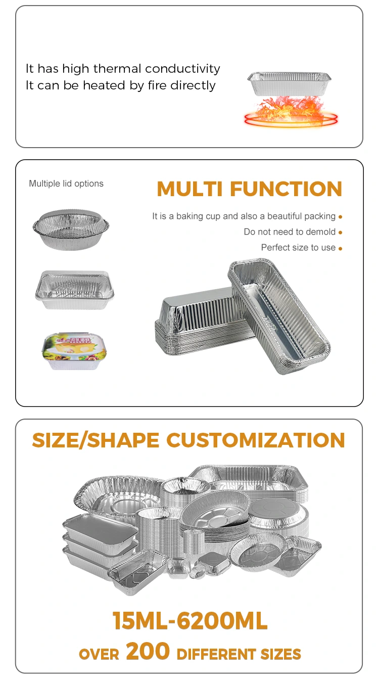 లక్షణాలు: దీర్ఘచతురస్రాకార బ్రెడ్ ట్రే సిల్వర్ అల్యూమినియం రేకు కంటైనర్లు ఆరోగ్యకరమైనవి మరియు పర్యావరణ అనుకూలమైనవి, ఆహార-గ్రేడ్ పదార్థాలను ఉపయోగించడం, సురక్షితమైన మరియు విషపూరితం కానివి, పునరుత్పాదక మరియు పర్యావరణ అనుకూలమైన పదార్థాలను ఉపయోగించడం, ఆహార భద్రతపై దృష్టి పెట్టడం మరియు మొత్తం ఉత్పత్తి నాణ్యతను కొనసాగించడం.