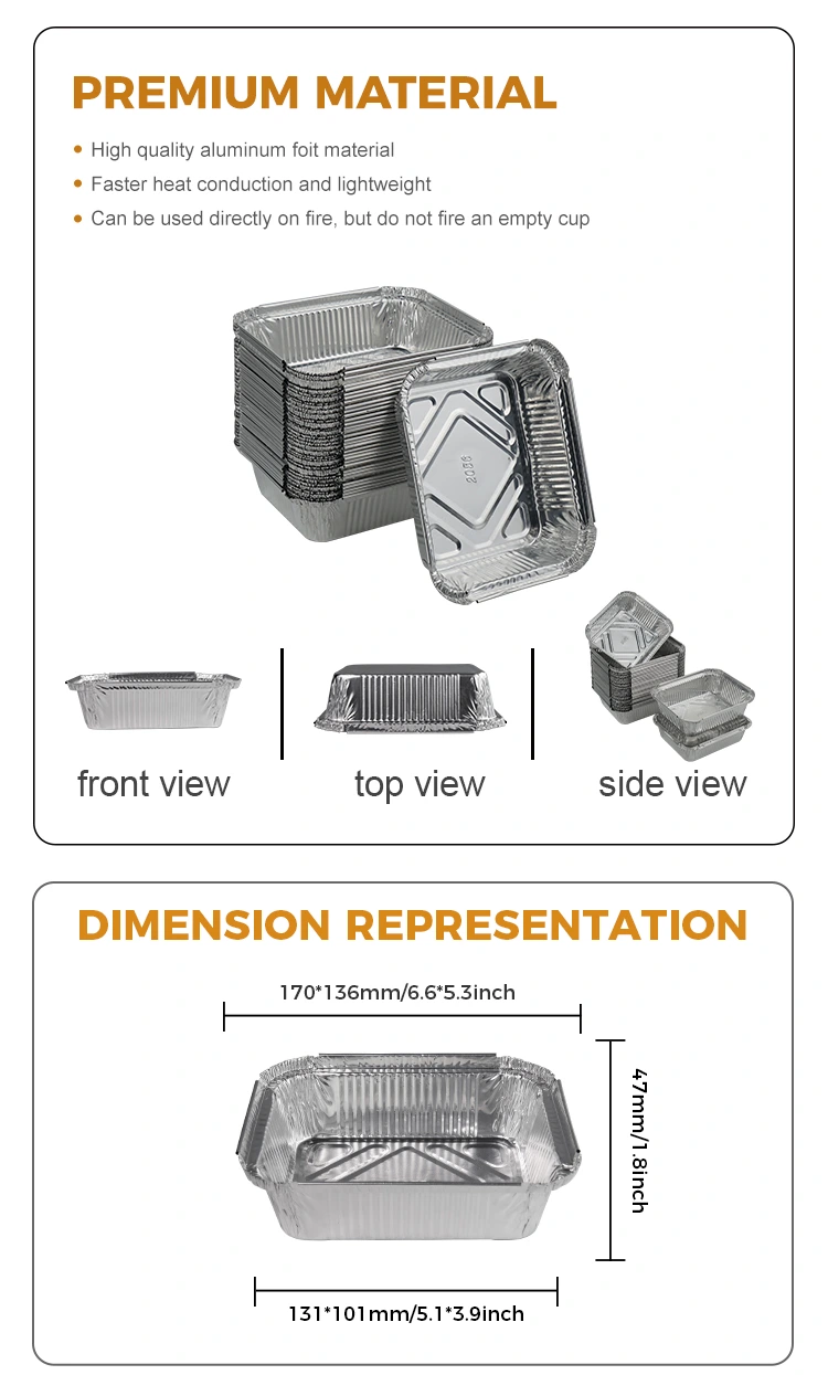 మేడ్ ఇన్ చైనా మోడల్ 2056 దీర్ఘచతురస్రాకార గ్రాటిన్ ప్యాకేజ్డ్ సిల్వర్ అల్యూమినియం రేకు కంటైనర్లు చాలా నిరాడంబరమైన పరిమాణం, 170*136 మిమీ (6.9*5.3 అంగుళాలు), 131*101 మిమీ (5.1*3.9 అంగుళాలు) యొక్క మూల వ్యాసం, 47 మిమీ (1.8 అంగుళాలు) మరియు 21. ఈ పరిమాణం తీసుకెళ్లడం చాలా సులభం మాత్రమే కాదు, వివిధ రకాల వినియోగ అవసరాలను కూడా తీరుస్తుంది.