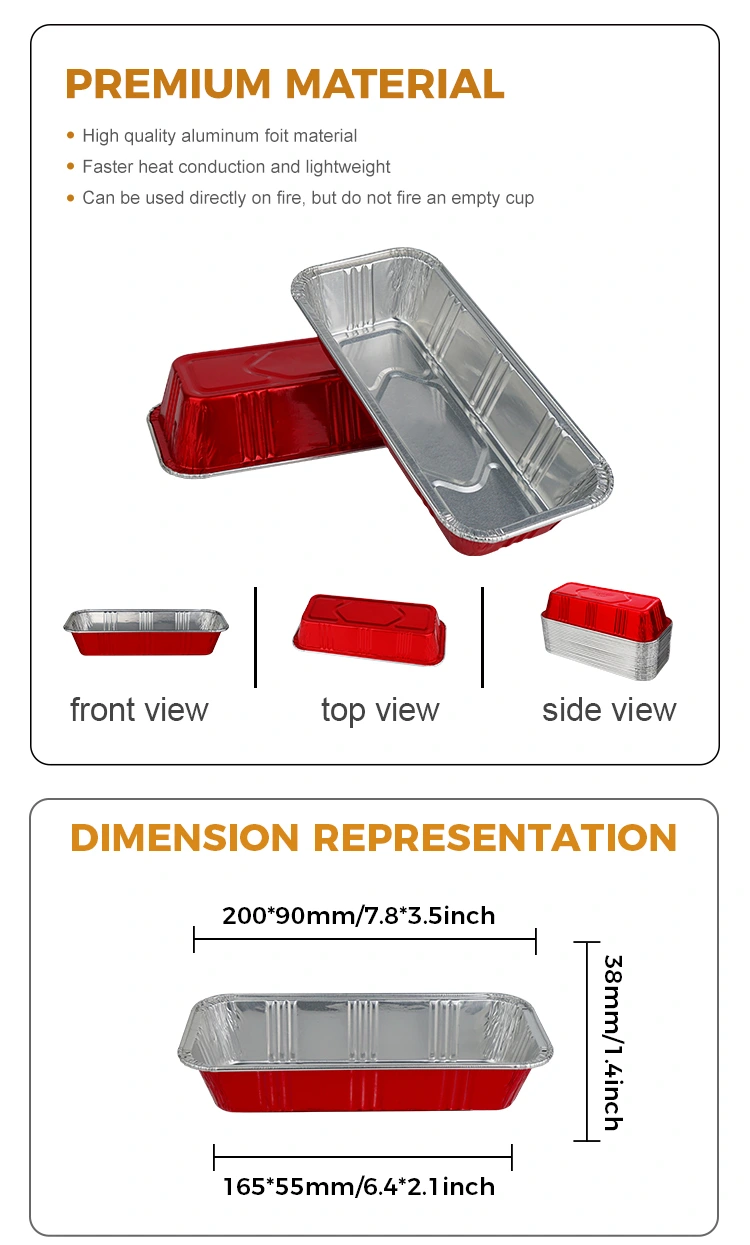 యుంచు అల్యూమినియం ఫాయిల్ సరఫరాదారు యొక్క దీర్ఘచతురస్రాకార రెడ్ బేకరీ క్యాటరింగ్ సిల్వర్ అల్యూమినియం ఫాయిల్ కంటైనర్‌లు మన్నికైన, ఓవెన్-సురక్షిత డిజైన్‌ను కలిగి ఉంటాయి. అవి అధిక ఉష్ణోగ్రతలు మరియు బహిరంగ మంటలలో కూడా స్థిరంగా ఉంటాయి, 220℃ కంటే ఎక్కువ ఉష్ణోగ్రతలను తట్టుకోగలవు, దహనాన్ని నిరోధించడానికి ఉష్ణ పంపిణీని అందిస్తాయి మరియు తాజాదనాన్ని లాక్ చేయడానికి బలమైన సీలింగ్‌ను అందిస్తాయి (గాలి మరియు తేమను నిరోధించడం, శీతలీకరణ తర్వాత కూడా బ్రెడ్‌ను మృదువుగా ఉంచడం). వారు పర్యావరణ మరియు సౌందర్య ప్రయోజనాలను కూడా అందిస్తారు. ఫుడ్-గ్రేడ్ అల్యూమినియం ఫాయిల్‌తో తయారు చేయబడి, అవి ప్యాకేజింగ్ రీసైక్లింగ్ ప్రమాణాలకు అనుగుణంగా ఉంటాయి మరియు పారవేయబడిన తర్వాత చట్టబద్ధమైన మార్గాల ద్వారా రీసైకిల్ చేయబడతాయి, సింగిల్ యూజ్ ప్లాస్టిక్ కంటైనర్‌ల పర్యావరణ భారాన్ని తగ్గిస్తాయి. పొడవాటి ఆకారం పొడవాటి రొట్టెల కొలతలకు ఖచ్చితంగా సరిపోతుంది, పిండి ఆకారాన్ని నిర్వహిస్తుంది మరియు బేకింగ్ సమయంలో విస్తరణ మరియు వైకల్యాన్ని నివారిస్తుంది. ఇది బేకింగ్ తర్వాత బ్రెడ్ చెక్కుచెదరకుండా, పొడిగించబడిన రూపాన్ని కలిగి ఉండేలా చేస్తుంది, దీని ఫలితంగా మరింత దృశ్యమానంగా ఆకట్టుకునే ఉత్పత్తి ప్రదర్శన, ముఖ్యంగా వాణిజ్య సెట్టింగ్‌లకు అనుకూలంగా ఉంటుంది.