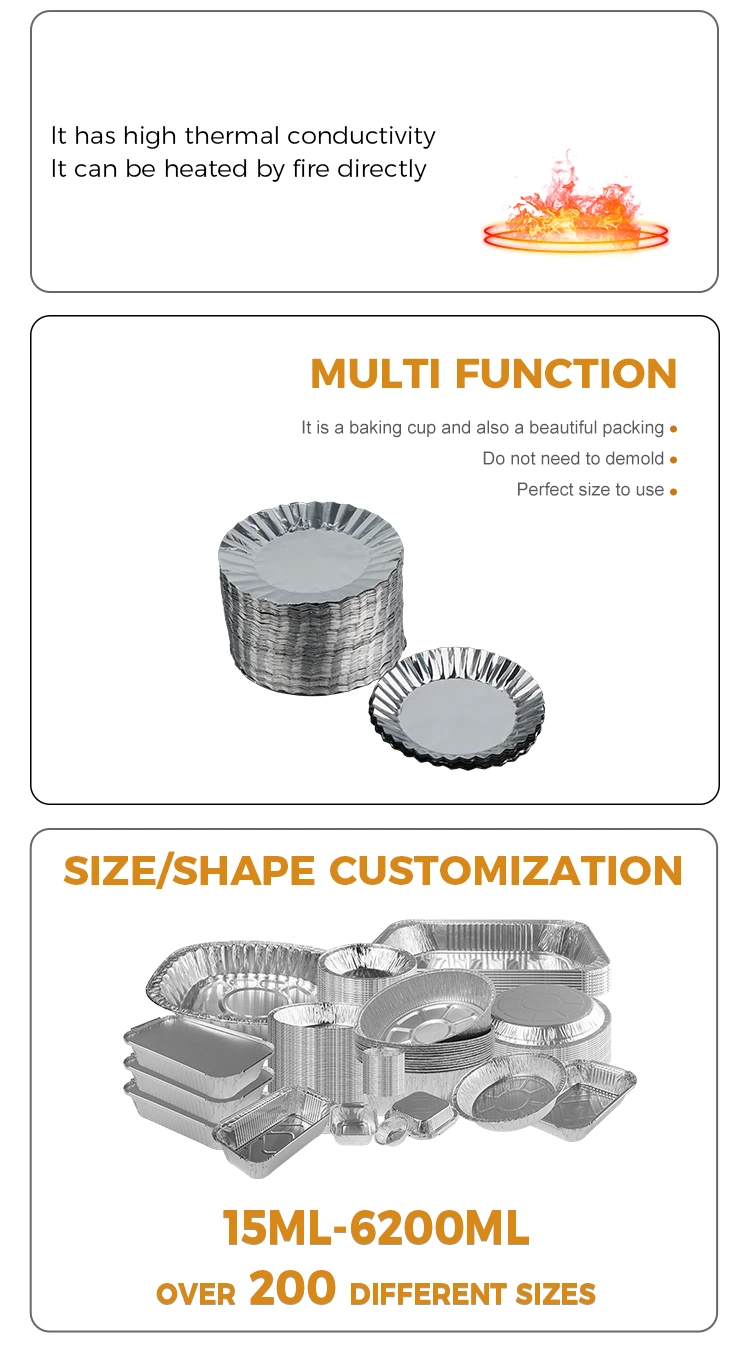 రౌండ్ బేకింగ్ కేక్ టిన్ సిల్వర్ అల్యూమినియం రేకు ఫుడ్ కంటైనర్‌తో యున్ చు అల్యూమినియం రేకు సరఫరాదారు అందించిన చాలా ఆలోచనాత్మక డిజైన్‌ను కలిగి ఉంది. అవి వృత్తాకార ఆకారంలో మరియు మితమైన పరిమాణంలో ఉంటాయి, వివిధ రకాల రొట్టెలు తయారు చేయడానికి అనువైనవి, అయితే కట్టింగ్ మరియు అలంకరణను కూడా సులభతరం చేస్తాయి. అంతేకాకుండా, ఆహారాన్ని ఉంచడానికి తగిన మద్దతును అందించడానికి మందం శాస్త్రీయంగా లెక్కించబడుతుంది, అయితే అధిక ఒత్తిడిని నివారించేటప్పుడు ఆహారం వైకల్యం లేదా పగుళ్లు ఏర్పడటానికి కారణమవుతుంది.
