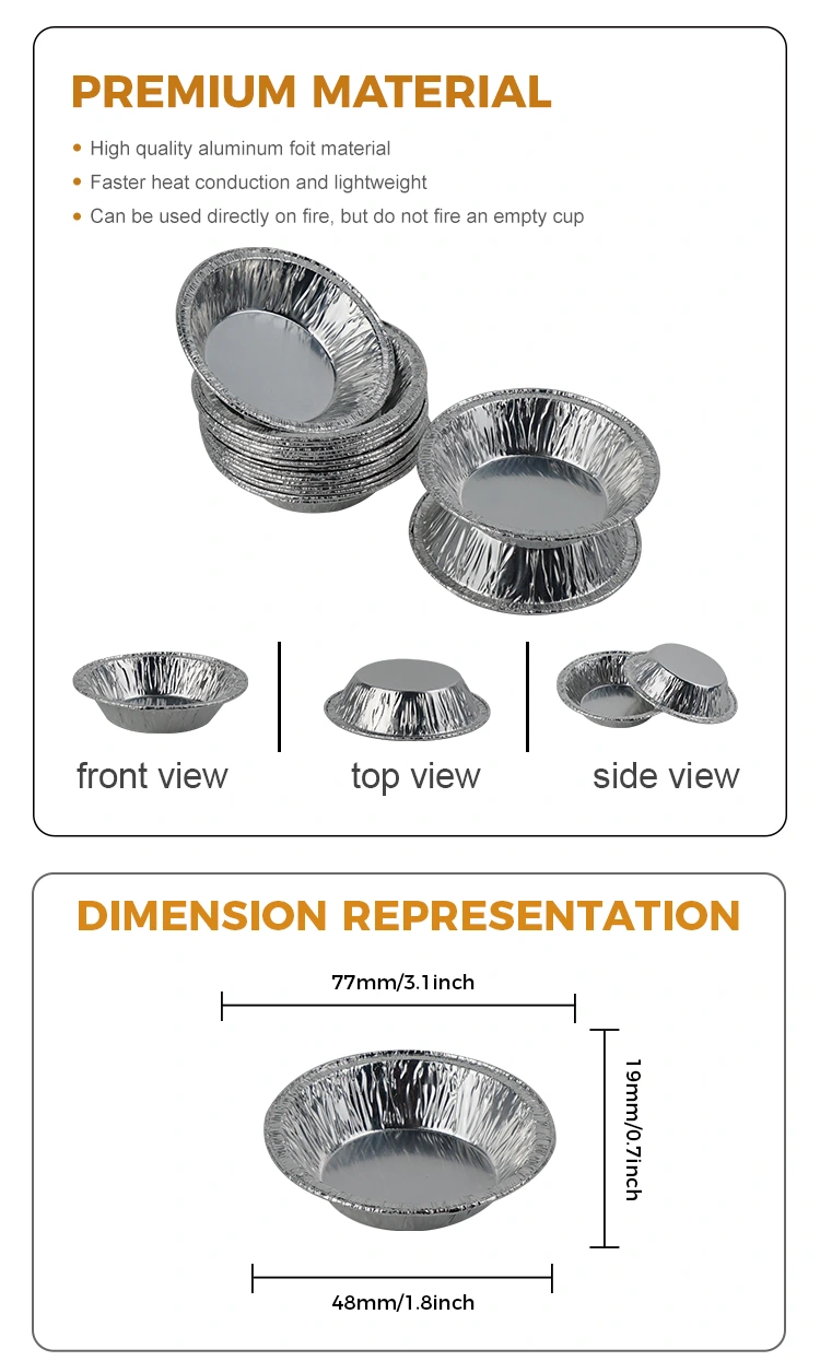 స్నాక్స్ కోసం ఈ రౌండ్ ఎగ్ టార్ట్ సిల్వర్ అల్యూమినియం రేకు ఫుడ్ కంటైనర్ 8011 ఫుడ్ కాంటాక్ట్ గ్రేడ్ అల్యూమినియం రేకు పదార్థంతో తయారు చేయబడింది, ఆహారంతో సంబంధాన్ని కలిగి ఉన్న భద్రతను నిర్ధారిస్తుంది, వైకల్యం చేయడం సులభం కాదు మరియు లీక్ చేయడం సులభం కాదు. దీని మందం బలంగా ఉంది, తుప్పు నిరోధకత, అధిక ఉష్ణోగ్రత నిరోధకత మరియు ఎక్కువ సేవా జీవితం.