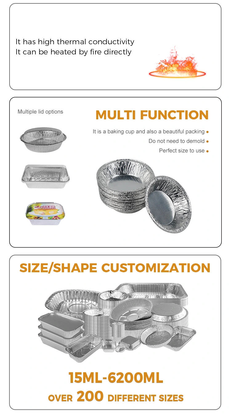 స్నాక్స్ సిల్వర్ అల్యూమినియం రేకు ఫుడ్ కంటైనర్, ఏకరీతి ఉష్ణ ప్రసరణ, బర్న్ చేయడం అంత సులభం కాదు, తాపన, రుచికరమైన మరియు సురక్షితమైనది కాదు. ఆయిల్ ప్రూఫ్ మరియు యాంటీ ఫౌలింగ్, డీమోల్డ్ చేయడం సులభం, చుట్టుపక్కల ముడతలుగల ఆకారం యాక్సెస్ చేయడం సులభం, దిగువ ఉపరితలం గుండ్రంగా మరియు మృదువైనది, ఒక క్లిక్ శీఘ్ర డీమోల్డింగ్, మరియు ఇది ఉపయోగం తర్వాత కోల్పోతుంది, శుభ్రం చేయవలసిన అవసరం లేదు. బహుళ పెద్ద-సామర్థ్యం గల డిజైన్, వన్-టైమ్ వాడకం, శ్రమతో, విస్తృతంగా ఉపయోగించాల్సిన అవసరం లేదు, కాల్చిన గుడ్డు టార్ట్‌లు, కేకులు, గుడ్డు పచ్చసొన క్రిస్ప్స్, బౌల్ కేకులు మరియు ఇతర రుచికరమైన పదార్ధాల కోసం ఉపయోగించవచ్చు.